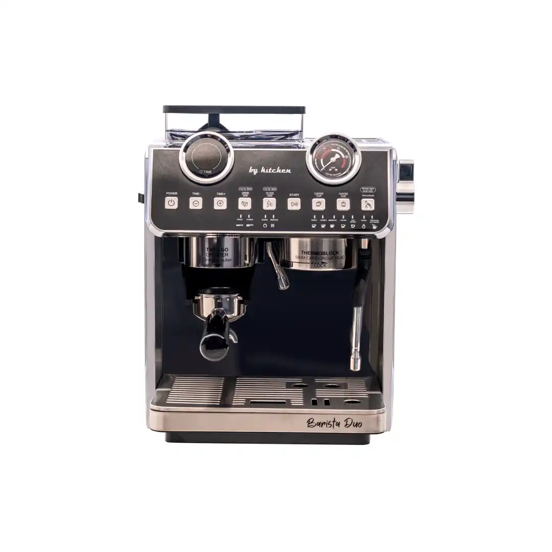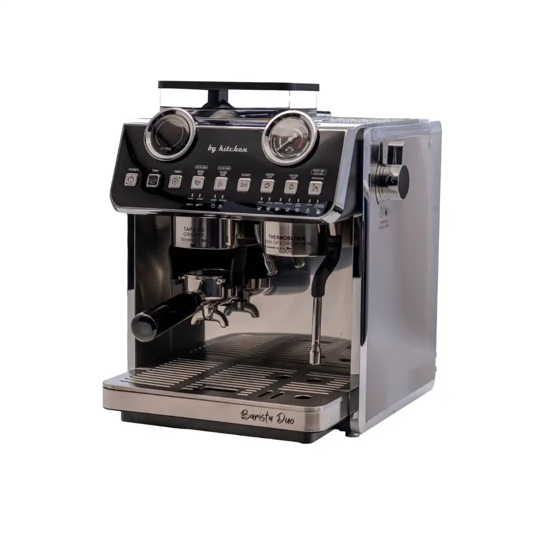 By Kitchen Barista Duo, çift pompa ve çift kazan teknolojisi, PID sıcaklık kontrolü ve paslanmaz çelik gövdesiyle ev ve profesyonel kullanımda barista kalitesinde kahve deneyimi sunar.