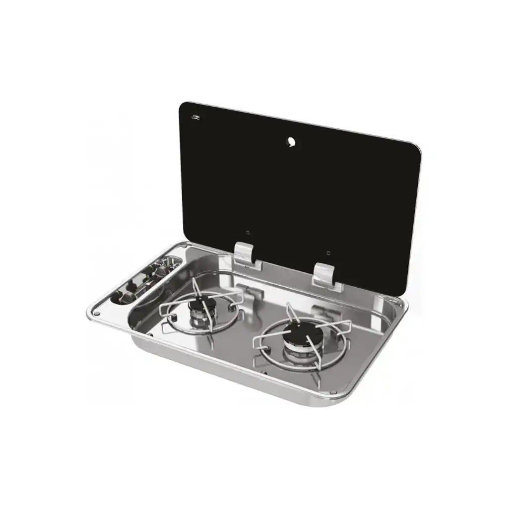 CanCan çift gözlü cam kapaklı ankastre ocak dikdörtgen, temperli siyah cam kapağı, 304L paslanmaz çelik gövdesi ve özel manşon tasarımıyla camper van, trailer, alkoven ve yat mutfaklarında güvenli, şık ve kompakt bir pişirme çözümü sunar.