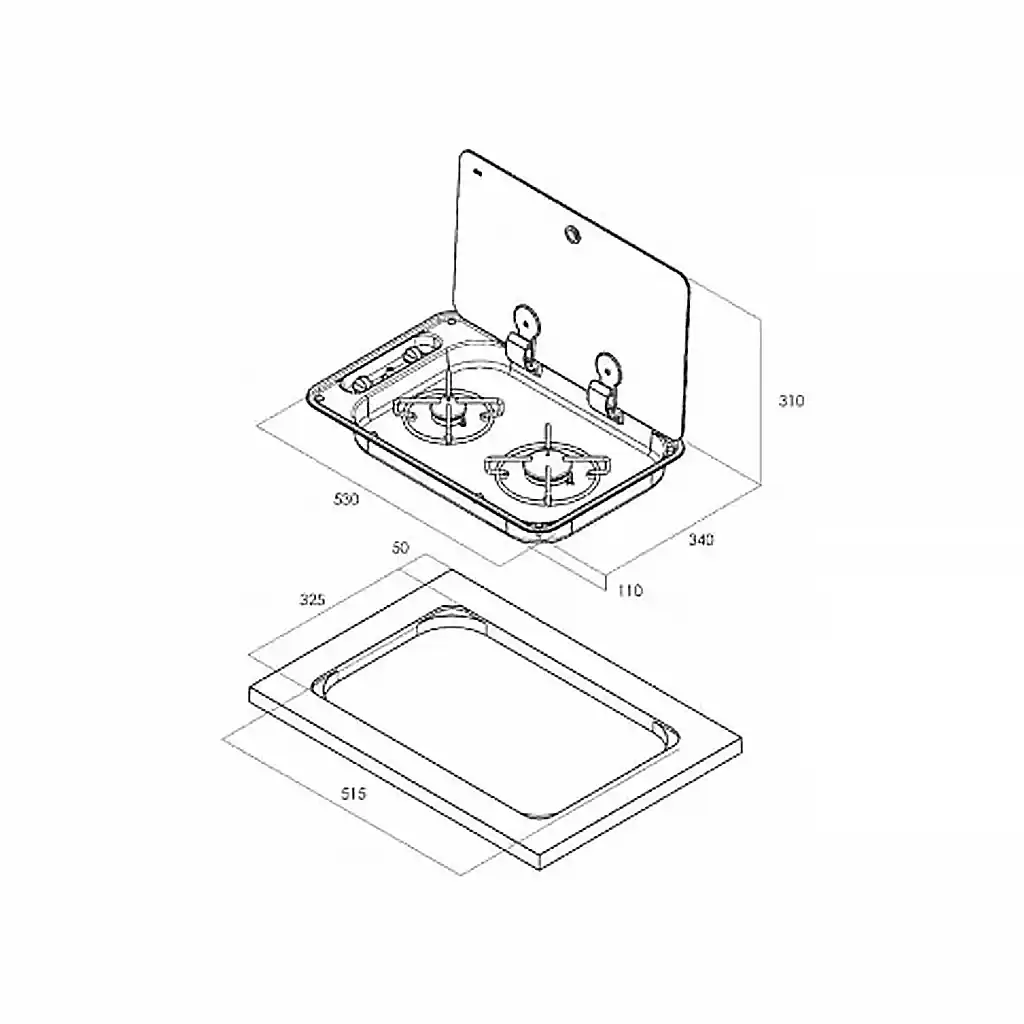 530 x 340 mm dış ölçüler ve 515 x 325 mm ankastre ölçüleri sayesinde birçok standart karavan ve yat tezgâhına uyum sağlar. 4,8 kg ağırlığıyla sağlam bir yapıya sahip olmasına rağmen montaj ve kullanım açısından pratiklik sunar. Gaz yakıtlı yapısı, verimli ısı dağılımı ve kontrollü pişirme performansı sağlar.
