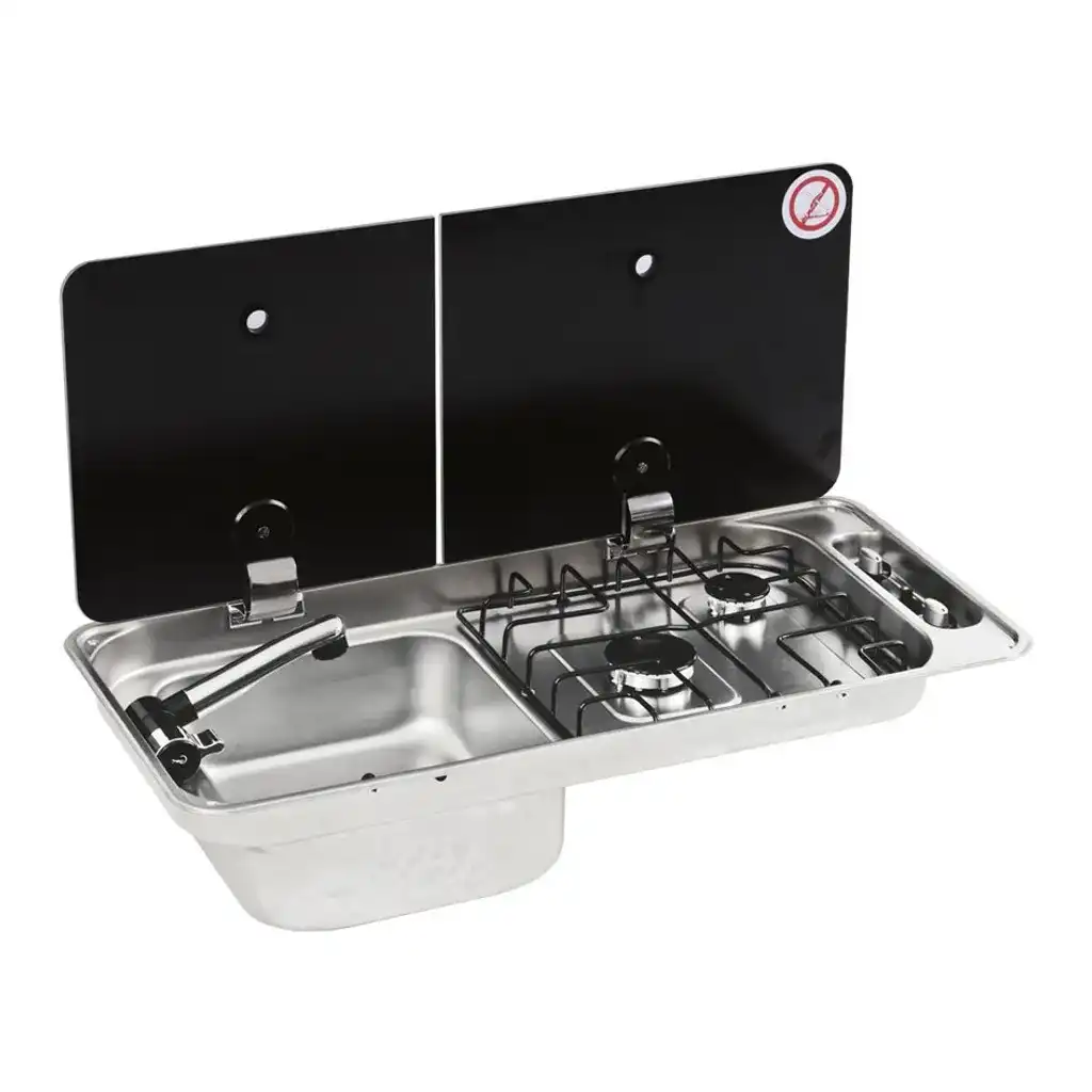 CanCan çift gözlü kombin ankastre ocak sağ ocak harici düğmeli, sağda harici kontrol düğmeli gaz ocağı ve solda entegre dikdörtgen eviye yapısıyla kompakt mutfaklarda yüksek işlevsellik sunar. Ayrık temperli cam kapakları ve 304L paslanmaz çelik gövdesiyle camper van, trailer, alkoven ve yat kullanımına uygundur.