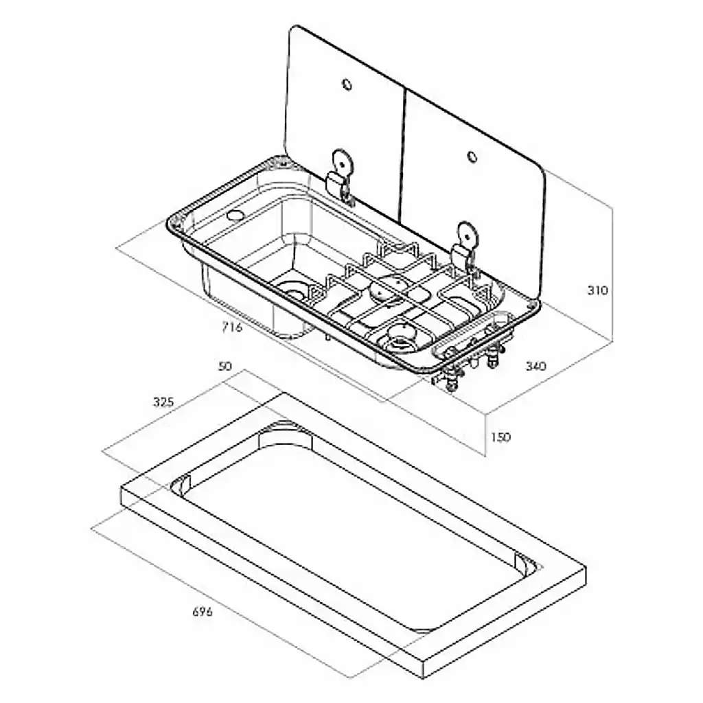 Paslanmaz çelik destek ızgarası titreşim önleyici damper ile sabitlenmiştir; bu özellik seyahat hâlindeki araçlarda çalkalanmayı ve ses oluşumunu azaltır. 716 x 340 x 150 mm ölçüleri ve 696 x 325 mm ankastre uyumu sayesinde birçok tezgâha kolayca entegre edilebilir.