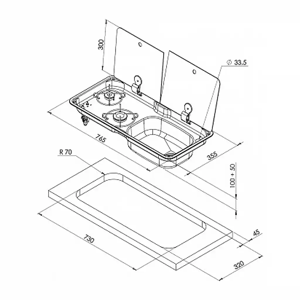 Can çift gözlü kombin ankastre ocak, sol tarafta konumlandırılmış gaz ocağı ve sağdaki dikdörtgen eviye yapısı sayesinde mobil yaşam alanlarında hem alanı optimize eder hem de yüksek kullanım konforu sunar. Bu kombinasyon, dar tezgâhlı karavan ve tekne mutfakları için özel olarak geliştirilmiştir.