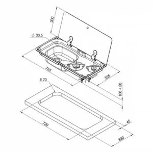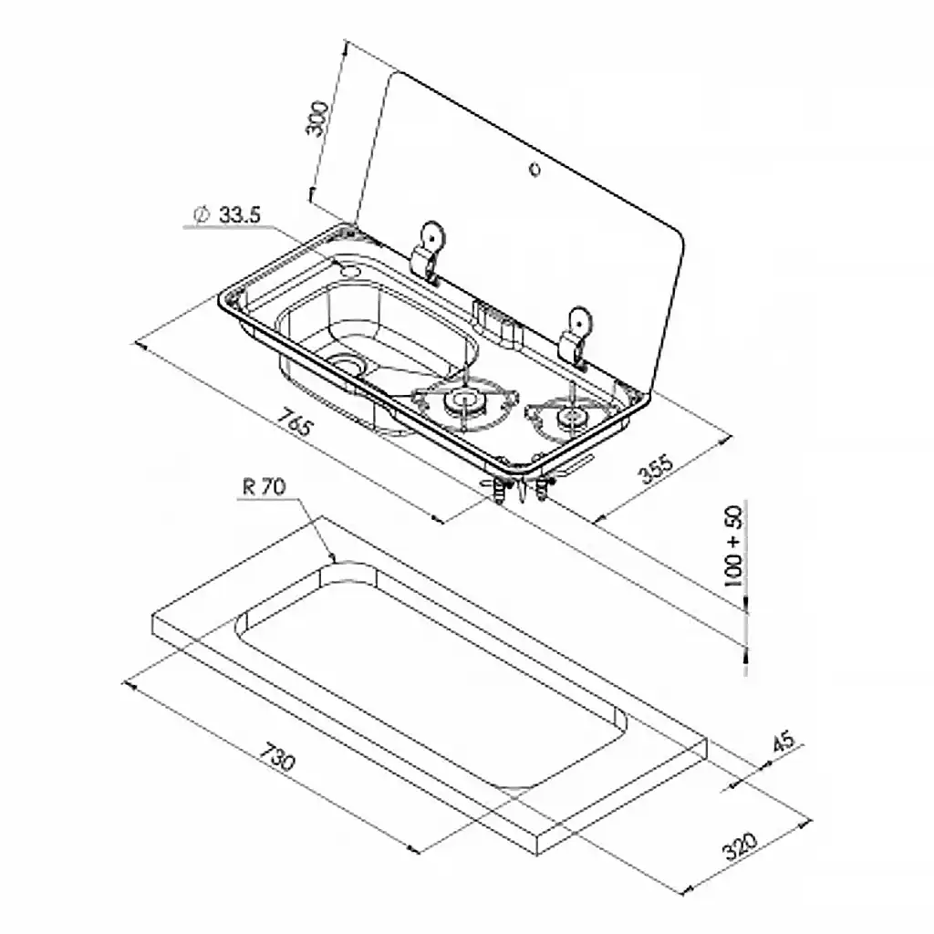 CanCan çift gözlü kombin ankastre ocak tek kapak ocak sağ gömülü düğmeli, sağda gömülü düğmeli gaz ocağı ve solda entegre dikdörtgen eviye yapısıyla dar mutfak alanlarında yüksek işlevsellik sağlar. Tek parça temperli cam kapağı ve 304L paslanmaz çelik gövdesiyle camper van, trailer, alkoven ve yat kullanımına uygundur.