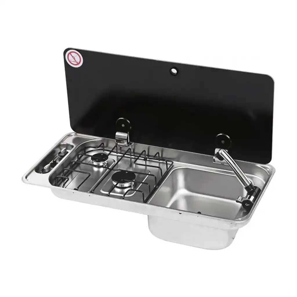 CanCan çift gözlü kombin ankastre ocak tek kapak ocak solda harici düğmeli, sol tarafta harici kontrol düğmeli gaz ocağı ve sağdaki dikdörtgen eviye modülüyle kompakt mutfak alanlarında maksimum verimlilik sunan bir çözümdür. Tek parça temperli cam kapak ve 304L paslanmaz çelik gövde yapısıyla camper van, trailer, alkoven ve yat kullanımına uygundur.