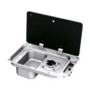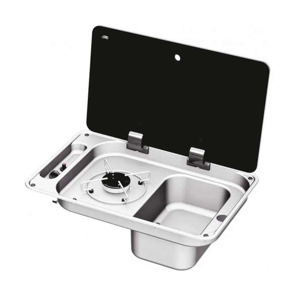 CanCan tek gözlü kombin ankastre ocak tek kapak ocak solda, sol taraftaki tek gözlü gaz ocağı ve sağdaki dikdörtgen eviye alanıyla kompakt mutfak düzenlerinde yüksek verimlilik sağlar. Temperli siyah cam kapağı ve 304L paslanmaz çelik yapısı sayesinde camper van, trailer, alkoven ve yat kullanımı için ideal bir çözümdür.