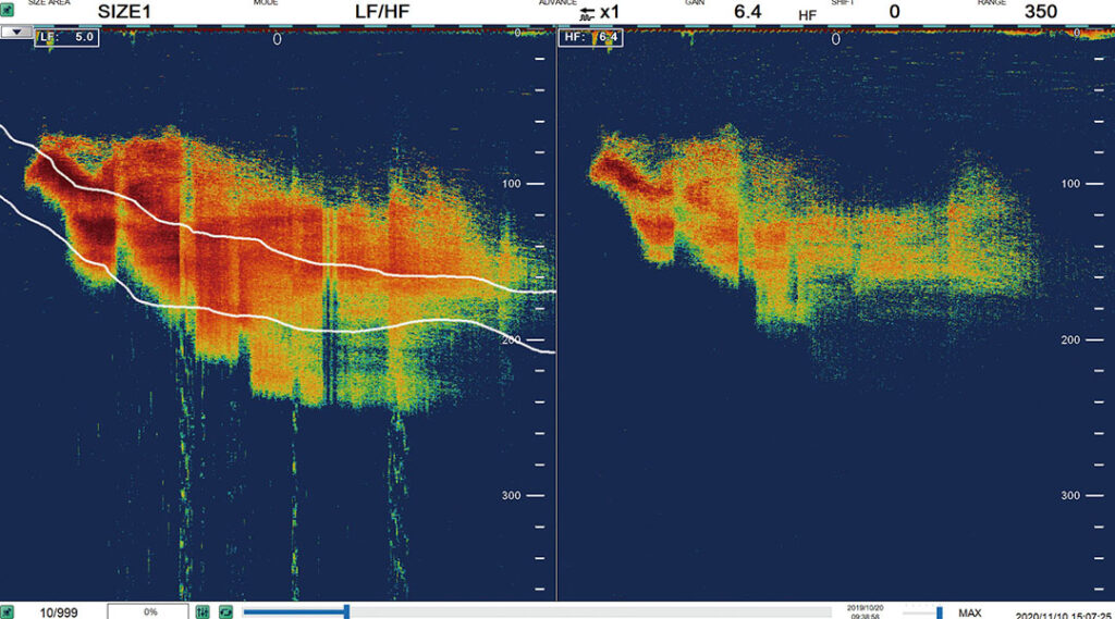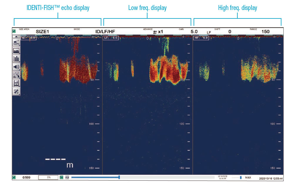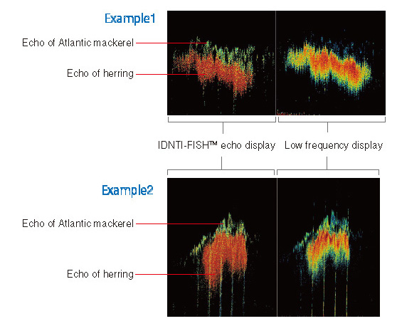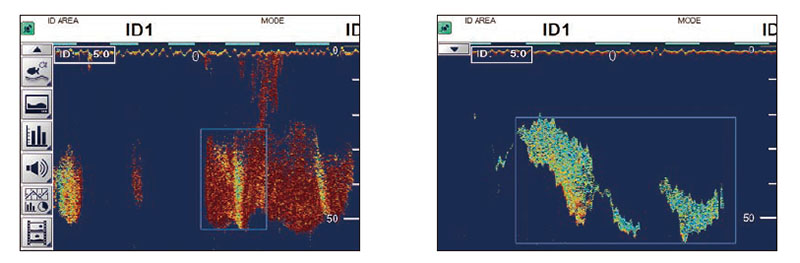 Sol: Yüksek/düşük frekanslı yankı ekranı / Sağ: IDENTI-FISH TM yankı ekranı