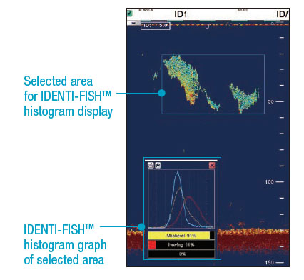 IDENTI-FISH TM yankı ekranı ve histogram grafiğinin kombinasyonu balık türlerini ayırt etmek için kullanışlıdır. FSS-3BB, bu benzersiz fonksiyonla her kullanıcıya özel bir balık bulucu olarak özelleştirilebilir.