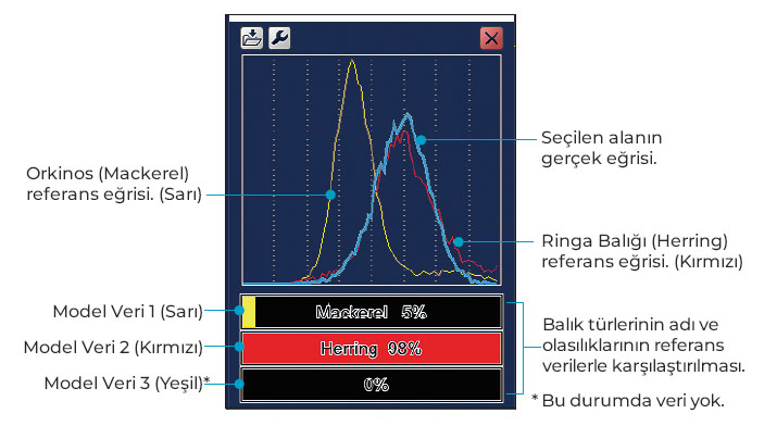 IDENTI-FISH TM grafiği, ölçüm aralığındaki balık sürüsünün histogramlarını model verileriyle karşılaştırır ve balık türlerinin benzerliğini sayısal değerler ve çubuk grafiklerle gösterir. Sisteme kaydedilen varsayılan model verileri Atlantik uskumru ve ringa balığıdır. Model verilerine yeni balık türleri ekleyebilir ve her balık türü için kendi referans eğrilerini oluşturabilirsiniz. Ekogramın iki alanı aynı anda ölçülebilir ve analiz edilebilir.