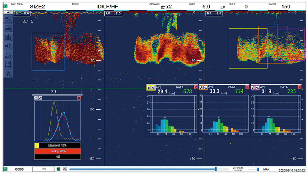 FSS-3BB, seçilen okuldaki balıkların büyüklüğünü ve dağılımını ölçer ve bu bilgiyi bir bakışta anlaşılabilecek bir grafikte görüntüler. TruEcho CHIRP™ teknolojisi, balık boyutu ölçümlerinin ve grafiklerinin doğruluğunu ve güvenilirliğini artırmıştır (maks.3). Bu işlev , belirli bir büyüklükteki balıkları hedeflerken önemli veriler olan balık büyüklüğünü ve sürü yoğunluğunu karşılaştırmanıza ve analiz etmenize olanak tanır .